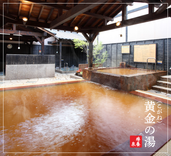 当店自慢の温泉は地下1,500メートルから湧き出る黄金色をしたお湯です。